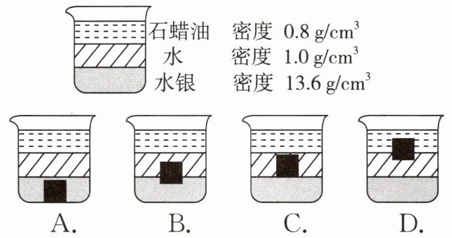 7. 如图所示,一个烧杯中盛有石蜡油、水和水银三种液体,三种液体之间互不相溶。将一实心铅块(铅的密度是$11.3 g/cm^3)$轻轻放入该烧杯中,下图中能正确显示铅块静止时位置的是( )