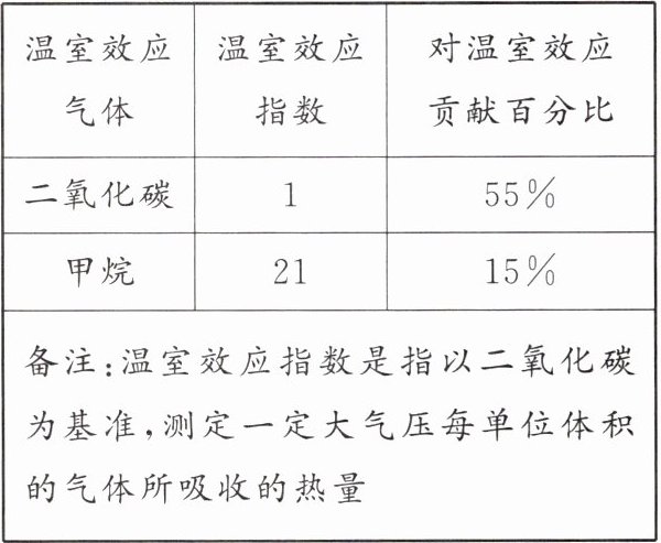 材料三:甲烷气体也会产生温室效应。如表为两种气体的温室效应指数及对地球温室效应的贡献百分比。
