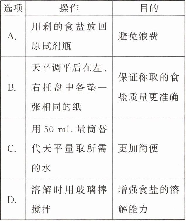| B. | 天平调平后在左、右托盘中各垫一张相同的纸 | 保证称取的食盐质量更准确 |
