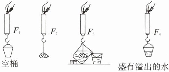 5. 小明同学在探究“浮力大小与排开水所受重力的关系”时,做了下图所示的实验,实验中四个步骤的弹簧测力计的示数分别为$F_{1}$、$F_{2}$、$F_{3}$、$F_{4}$,下列等式正确的是( )