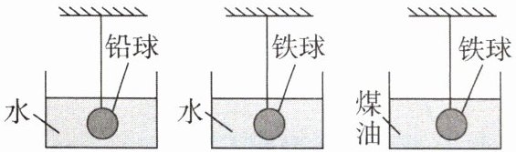 10. 一个铅球和两个铁球,它们体积相同,使其分别浸入水和煤油中,如图所示。若三者受到的浮力大小分别为$F_{1}$、$F_{2}$、$F_{3}$,则以下选项正确的是($\rho_{煤油}= 0.8×10^{3}\ kg/m^3$)( )