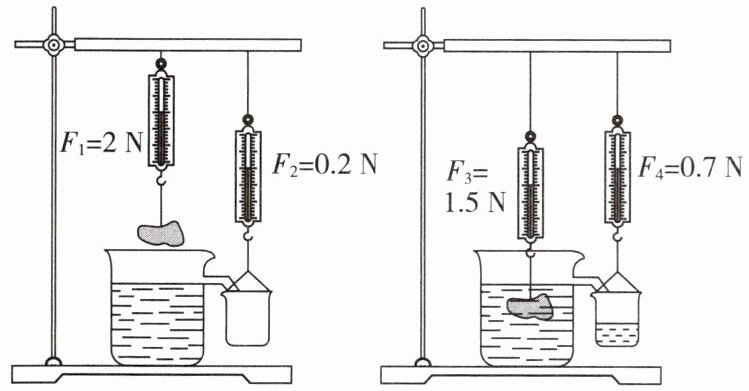 12. 用下图所示实验装置验证阿基米德原理。实验中,当物体浸入装满水的溢水杯中时,水会流入空桶。回答下列问题。