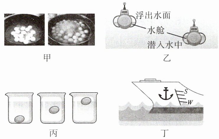 D.图丁中轮船从长江驶入大海,船体上的吃水线W线在上浮后浮出水面