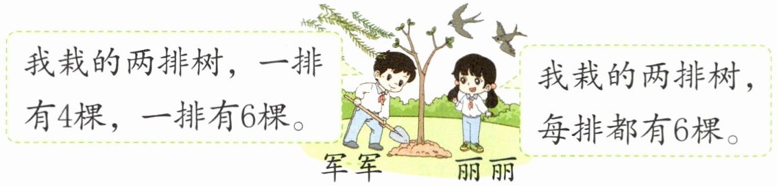 2. 军军和丽丽都栽了两排树,他们谁栽得多?