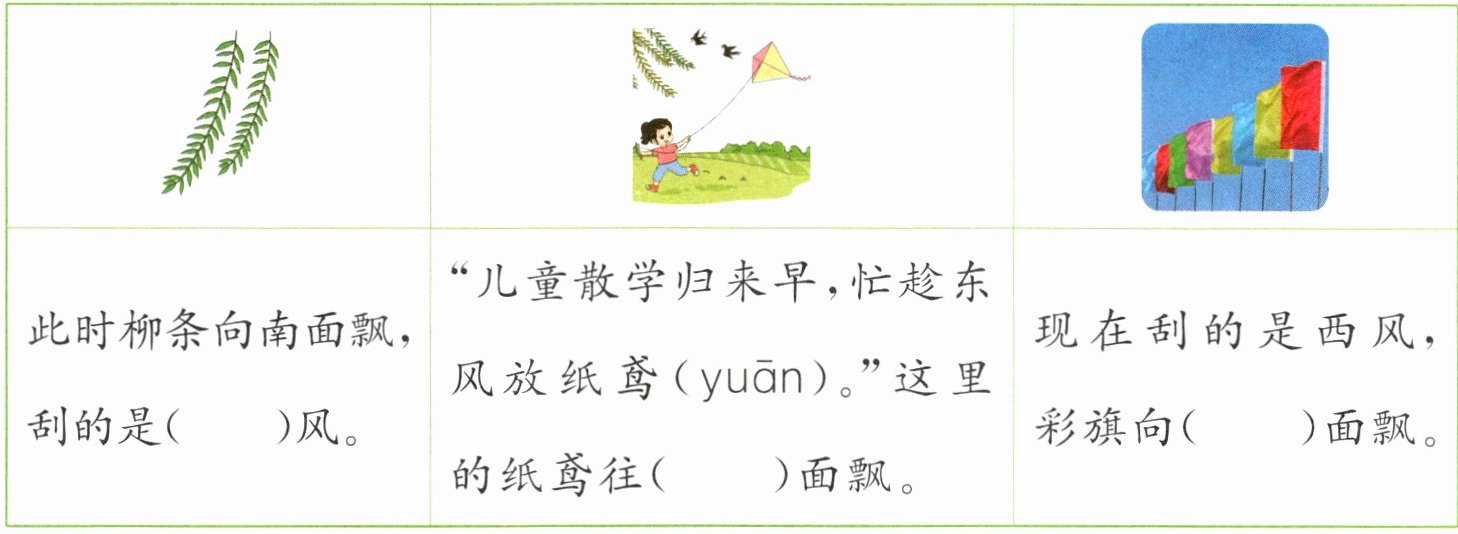 |此时柳条向南面飘,刮的是( )风。|“儿童散学归来早,忙趁东风放纸鸢(yuān)。”这里的纸鸢往( )面飘。|现在刮的是西风,彩旗向( )面飘。|