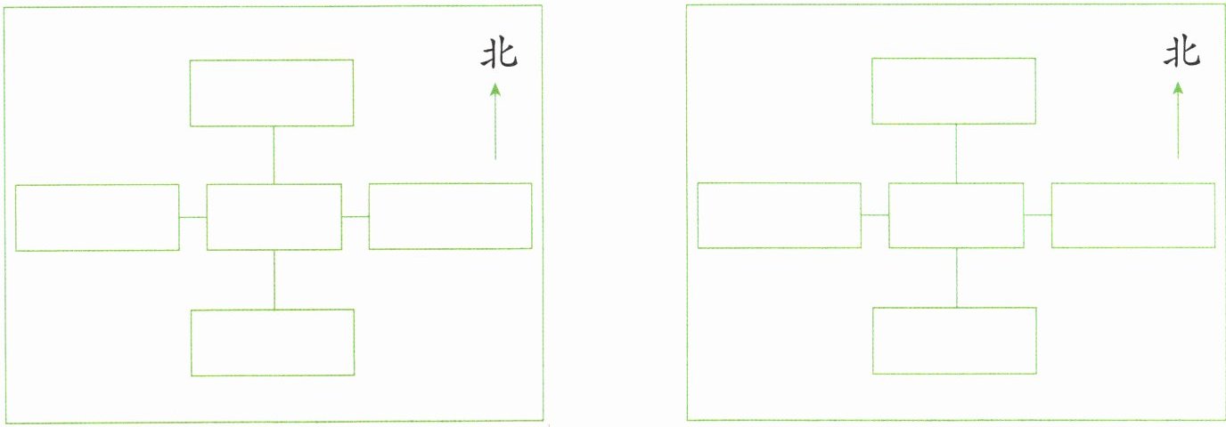 (4)下面是两位同学选择不同的观测地点,记录的东、西、南、北四个方向所看到的建筑物,把它们的位置关系在下面的示意图中画一画。