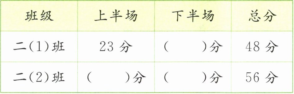 3. 二(1)班和二(2)班进行篮球比赛,分为上半场和下半场,全全记录了部分得分,并且知道下半场两个班的得分同样多,算一算并补全下表。