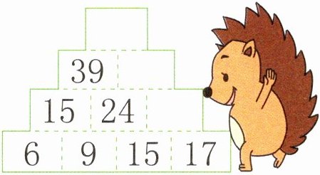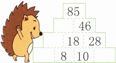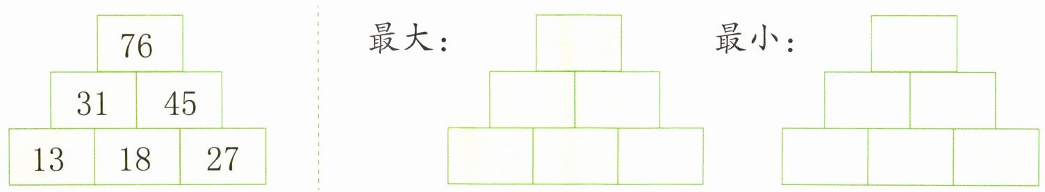 [解析]观察发现,上面格子里的数等于它下面两个格子里的数的和,因为最下面中间格子里的数既要与它左边格子里的数相加,又要与它右边格子里的数相加,所以要使最上面格子里的数最大,最下面中间格子里的数应最大;要使最上面格子里的数最小,最下面中间格子里的数应最小。27>18>13,最大的数是27,最小的数是13,则最下面中间格子里的数是27时,最上面格子里的数最大,如图所示。