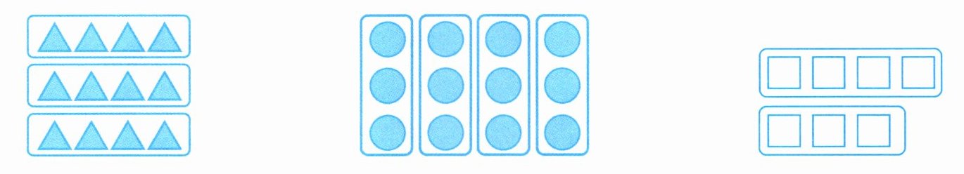 2. 下列哪幅图可以用来表示“一辆缆车坐4个人,3辆缆车可以坐多少个人”?在括号里画“√”。