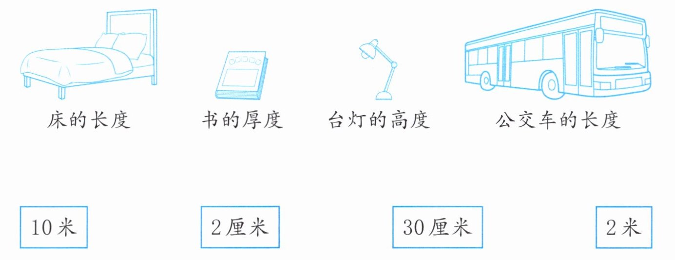 综上,连线结果为:床的长度——2米;书的厚度——2厘米;台灯的高度——30厘米;公交车的长度——10米。