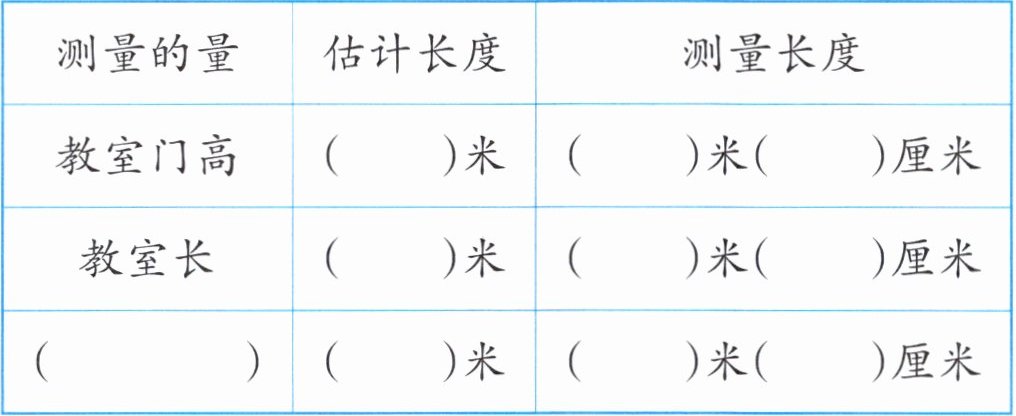 (黑板长):估计长度(4)米,测量长度(4)米(20)厘米。
