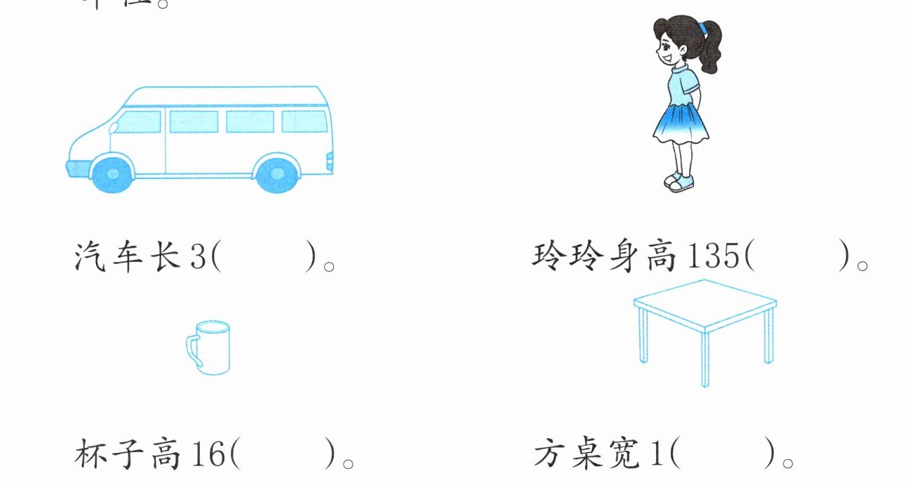 2. 根据物体实际的长度或高度,在括号里填上合适的长度单位。