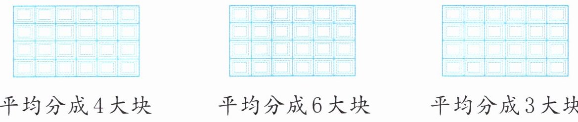 综上,平均分成$4$大块时每大块$\boldsymbol{6}$个小方块;平均分成$6$大块时每大块$\boldsymbol{4}$个小方块;平均分成$3$大块时每大块$\boldsymbol{8}$个小方块。