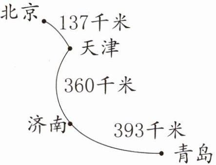 4. 李叔叔乘火车从北京出发,途经天津、济南到达青岛,如果火车平均每小时行150千米,他6小时能不能从北京到达青岛?(5分)