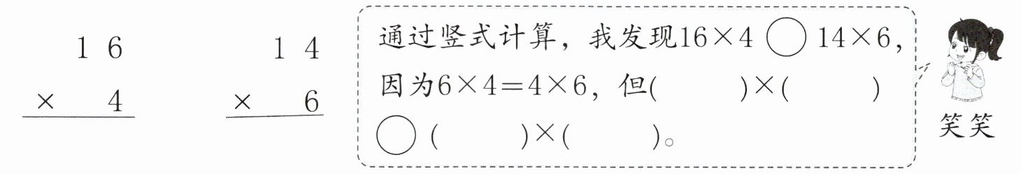 通过竖式计算,我发现$16×4$○$14×6$,因为$6×4= 4×6$,但( )×( )○( )×( )。 笑笑
