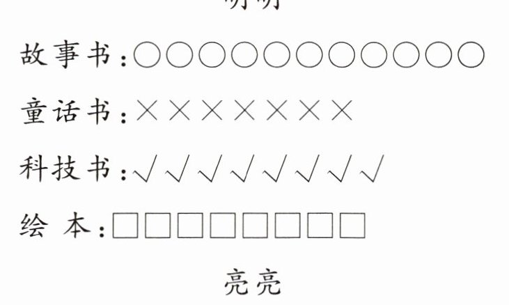 2. 提升 三(1)班准备购买一批图书,所以先对每个同学最喜欢的课外书进行了调查。下面是明明和亮亮对调查结果的记录:
