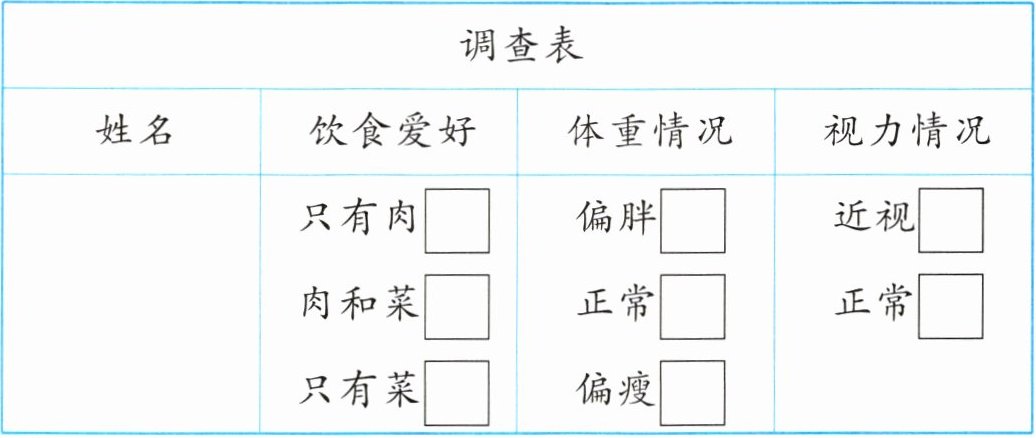 1. 品品想知道身边好朋友们的饮食爱好、体重情况和视力情况,于是用课外时间设计调查表来收集数据。调查表如下:
