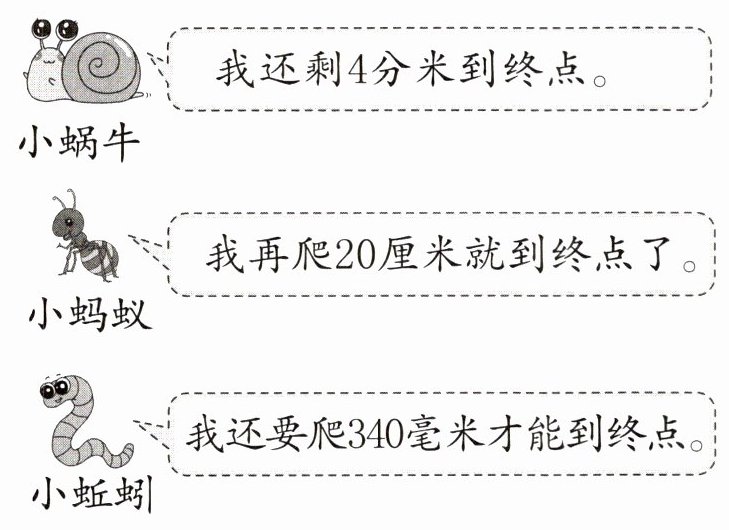 2. 基础 小蜗牛、小蚂蚁和小蚯蚓由南向北比赛爬行,( )离终点最近。(教材P54第4题变式)