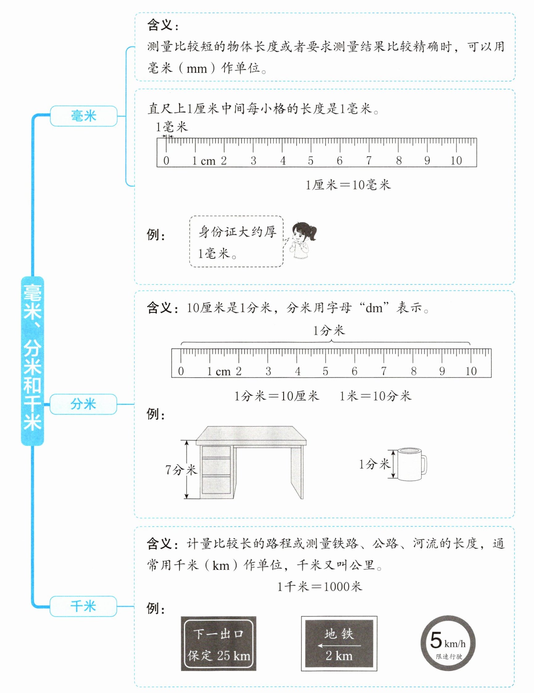 含义:测量比较短的物体长度或者要求测量结果比较精确时,可以用毫米(mm)作单位。