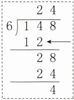 (2)学校新购进了148本书,准备平均分给三年级的6个班,每个班可以分到多少本?下面是明明列的竖式,竖式中箭头所指的“12”表示的意思是( )。