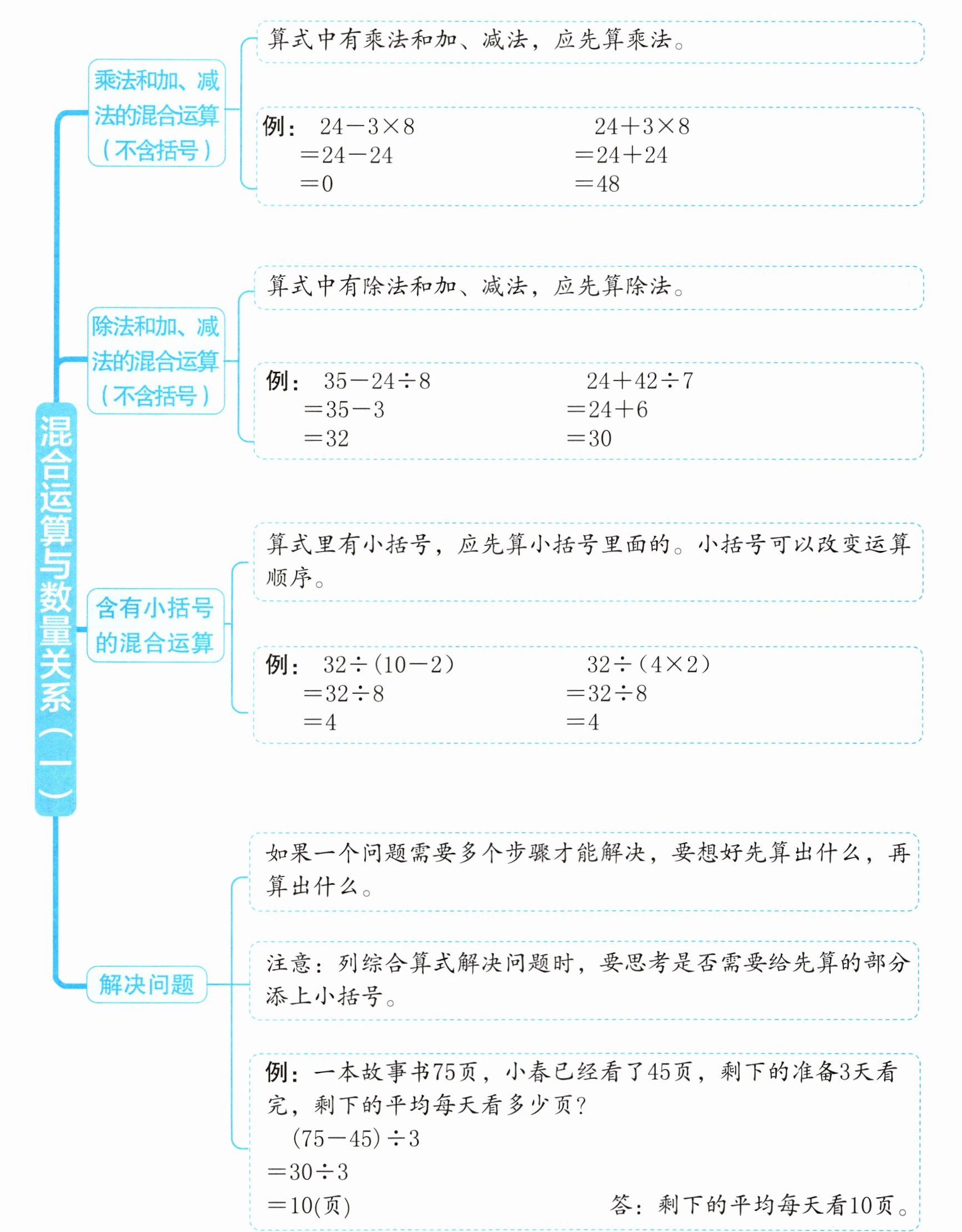 4. 解决问题时,如一本故事书75页,小春已经看了45页,剩下的准备3天看完,求剩下的平均每天看多少页,列综合算式为$(75 - 45)÷3$,先算括号里的$75 - 45 = 30$,再算除法$30÷3 = 10$(页),答:剩下的平均每天看10页。