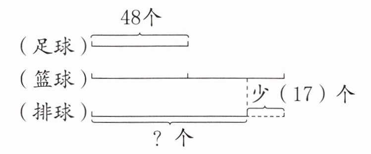 例:学校体育器材室中,足球有48个,篮球的个数是足球的2倍,排球比篮球少17个。排球有多少个?