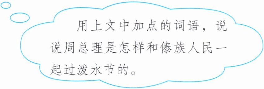 【解析】:本题是二年级语文上册的题目,主要考查学生对文本内容的理解和表达能力,要求学生能够从文中提取关键信息,并用给定的词语来描述周总理和傣族人民一起过泼水节的过程。解题的关键在于仔细阅读文本,找到文中加点的词语,然后按照顺序梳理出周总理的行为动作,再用通顺的语言进行表述。