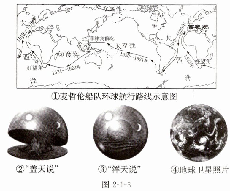 3. 人类对地球形状的认识经历了漫长而艰难的探索过程。图2-1-3示意人类探索地球形状的过程。人类对地球形状的探索过程,按时间先后排序正确的是( )