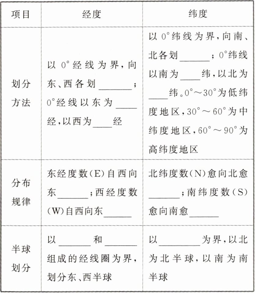 |划分方法|以0°经线为界,向东、西各划______;0°经线以东为______经,以西为______经|以0°纬线为界,向南、北各划______;0°纬线以南为______纬,以北为______纬。0°~30°为低纬度地区,30°~60°为中纬度地区,60°~90°为高纬度地区|