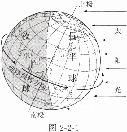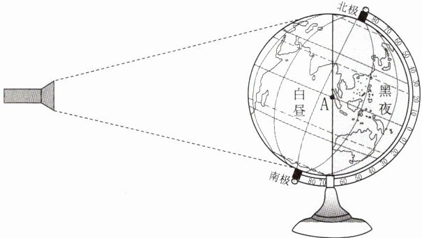 如图2-2-3所示,在暗室里,用手电筒作为光源照射地球仪,并自西向东拨动地球仪使其绕地轴转动。读图,完成3~4题。