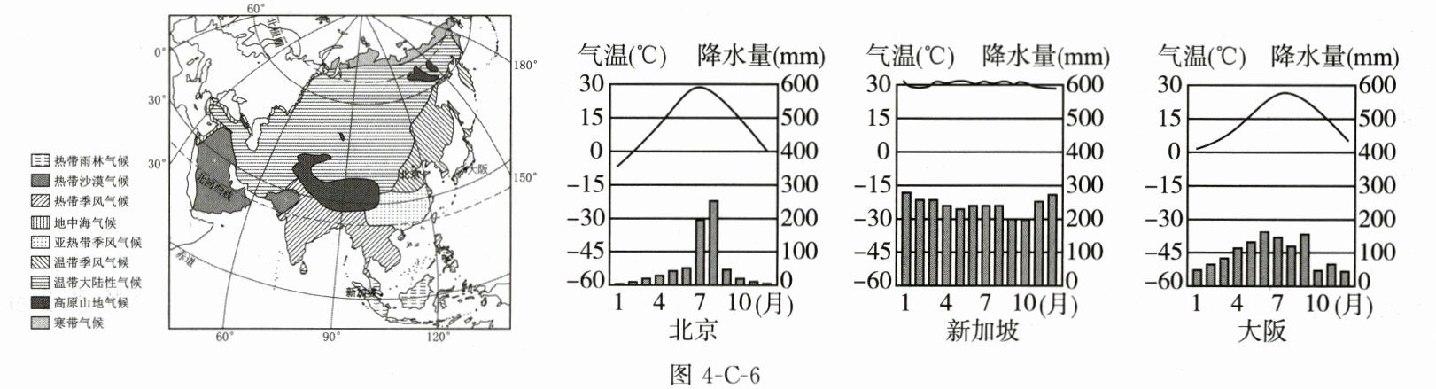 亚洲有三家环球影城,分别在中国北京、日本大阪和新加坡。读亚洲气候类型分布图及三大环球影城所在地气温曲线和降水量柱状图,完成9~10题。