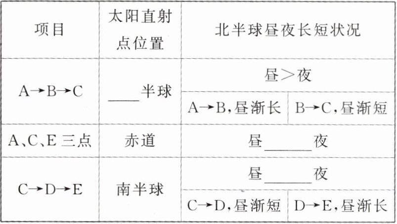 | C→D→E | 南半球 | 昼____夜C→D,昼渐短D→E,昼渐长 |