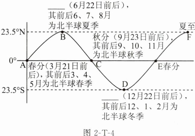 2. 以北半球为例,分析图2-T-4中太阳直射点位置与昼夜长短的情况,具体如下表所示: