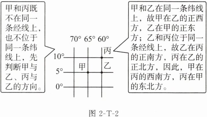②如果两点既不位于同一条纬线上,也不位于同一条经线上,在判断方向的时候既要判断两点的东西方向,还要判断两点的南北方向。如判断图2-T-2中甲、丙两点的方向,首先乙点与甲点位于同一条纬线,乙点与丙点位于同一条经线上,通过①中方法两两比较来判断甲与乙、丙与乙的方向,再转化为判断甲、丙两点的方向。