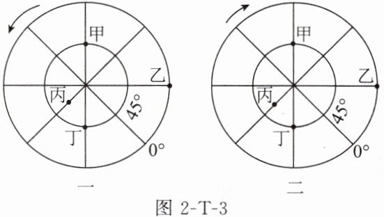 ①在以北极点为中心的地图上,地球自转方向呈逆时针。如图一中,甲在乙的______方,丙在丁的______方。