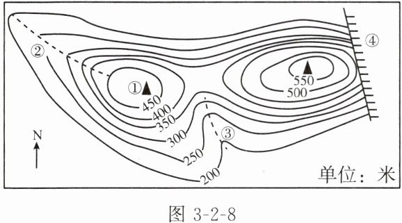 图中①②③④为地形部位标记点,N(指向标),单位:米