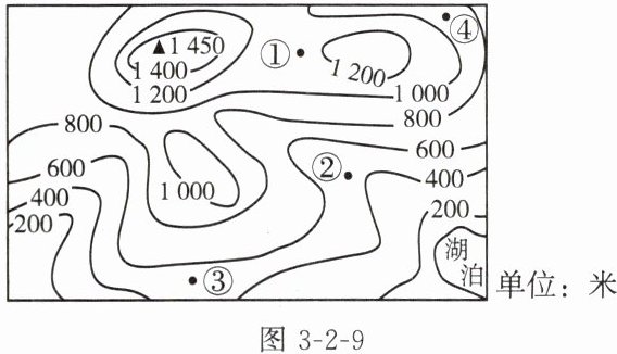 图中有①②③④四点,标注海拔数值(如1450、1200等),湖泊,单位:米