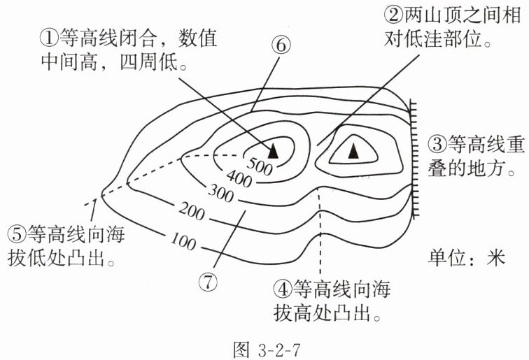 ①等高线闭合,数值中间高,四周低。②两山顶之间相对低注部位。③等高线重叠的地方。④等高线向海拔高处凸出。⑤等高线向海拔低处凸出。⑥⑦(图中标记点)单位:米