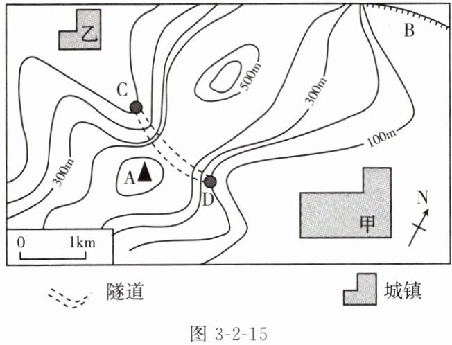 图中有A(山顶,▲)、B、C、D地点,甲、乙城镇,隧道(点虚线),等高线(100、200、300、400、500等),指向标(N),比例尺0 1km