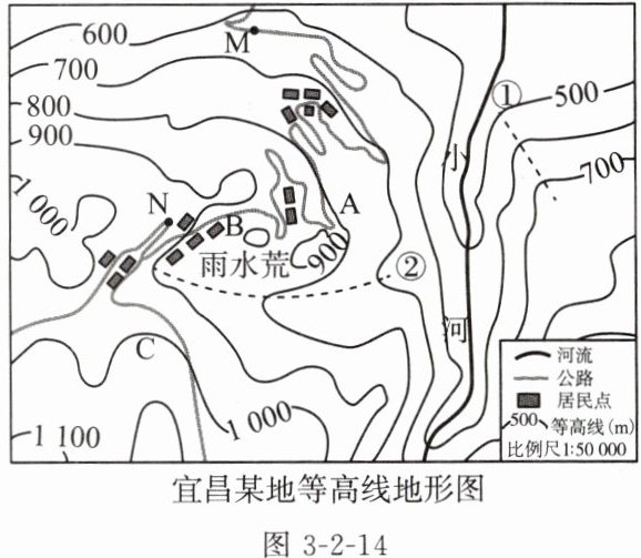 图中有A、B、C三处,①②虚线,雨水荒村落,居民点,公路,河流,等高线(200、300、400、500、600、700、800、900、1000、1100等),比例尺1:50000