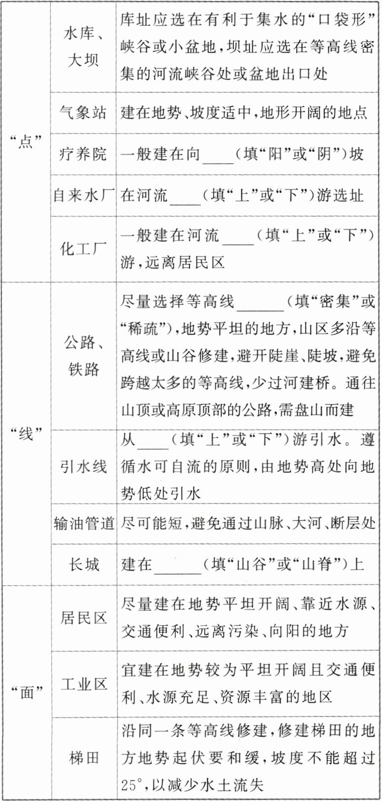 | |水库、大坝|库址应选在有利于集水的“口袋形”峡谷或小盆地,坝址应选在等高线密集的河流峡谷处或盆地出口处|