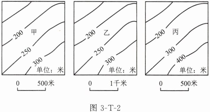 (2)比例尺、等高线疏密相同,等高距越大,坡越陡;等高距越小,坡越缓。如图3-T-2中坡度大小为:甲坡度______丙坡度。
