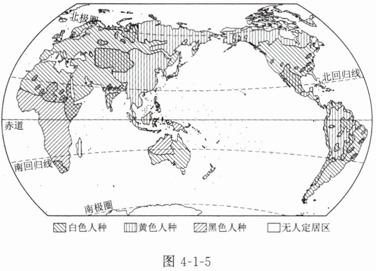 人种是根据人类体质特征划分的。读世界三大人种分布图,完成5~6题。