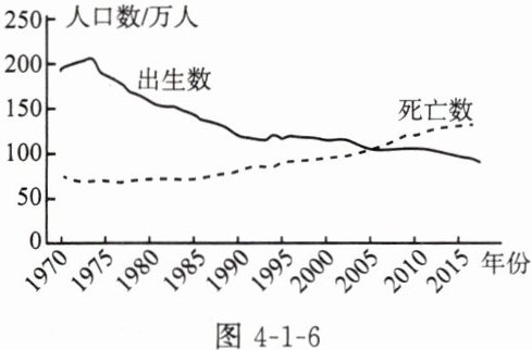 下图示意某国人口出生数与死亡数变化曲线。读图,完成7~8题。