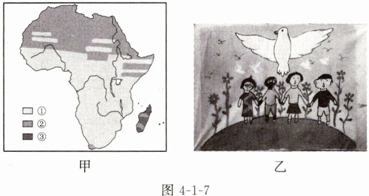人种是指在体质上具有某些共同遗传特征的人群。不同人种对人类文明都作出了自己的贡献。图4-1-7甲为某大洲人种分布图,图乙为某儿童绘画作品。读图,完成9~10题。