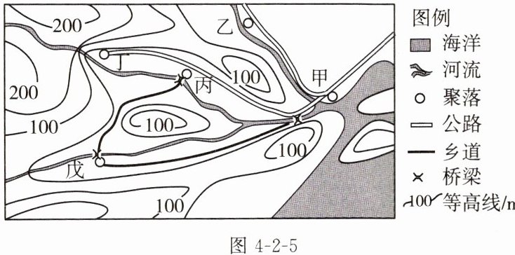 图例:海洋、河流、聚落、公路、乡道、桥梁、等高线(m)