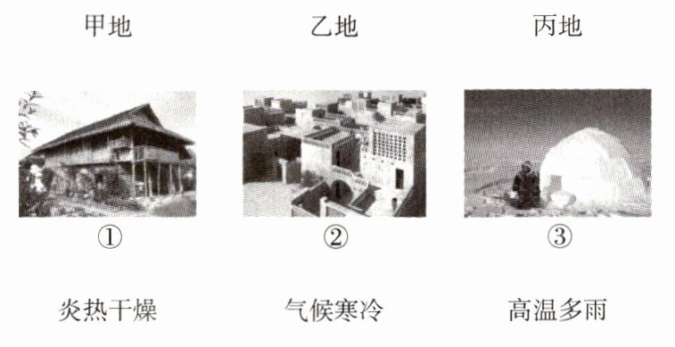(3)甲地—②—炎热干燥;乙地—①—高温多雨;丙地—③—气候寒冷
