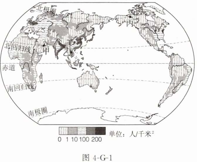 1. 地理课上,同学们探究人口、聚落与自然环境的关系。下图为世界人口分布图。阅读图文资料,回答下列问题。