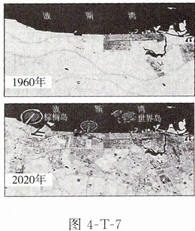 迪拜目前是一座现代化的国际大都市。右图为迪拜及其周边地区1960年和2020年影像图,图中的“世界岛”与棕榈岛是迪拜建造的著名人造海岛。