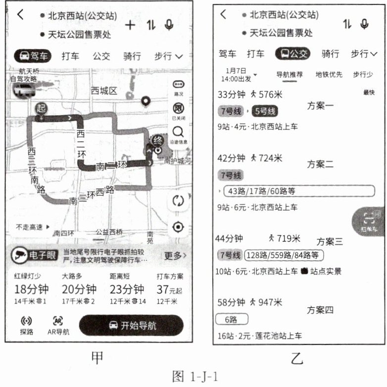 珠珠一家到北京旅游,出北京西站后,他们首先想到天坛公园去玩。珠珠打开导航查询,图甲示意驾车路线,图乙示意公交路线推荐的四种方案。读图,完成下列问题。